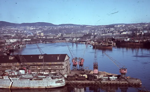 Utsikt over Bjørvika fra toppen av kornsiloen på Vippetangen. Båter ved kai, nærmeste er Larvikferga "Peter Wessel". Havnekraner. Sannsynligvis fotografert av tysk soldat under krigen.
