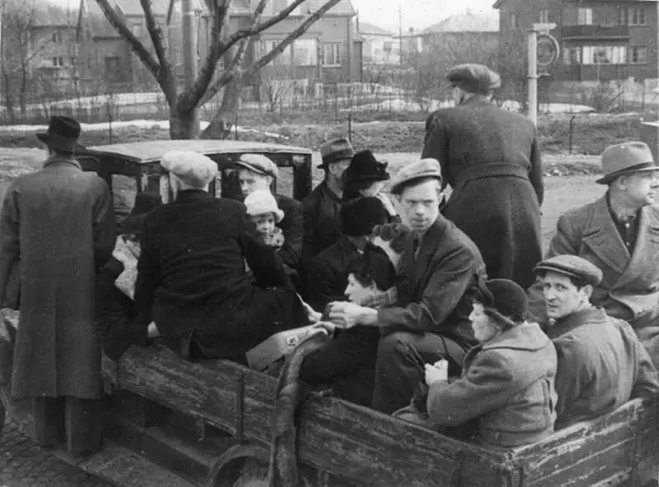 Panikkdagen 10. april etter rykter om bombing av Oslo fra britiske bombefly. Presis klokken 11.30 onsdag 10. april 1940 gikk flyalarmen. Lastebil med familie og mennesker på flukt langs Trondheimsveien. Villabebyggelse i bakgrunnen.