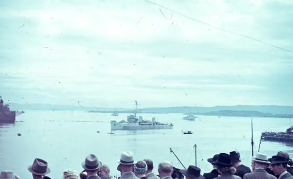 Folkemengde på Rådhusplassen ved Honnørbrygga venter trolig på kronprins Olavs hjemkomst den 13.mai 1945.