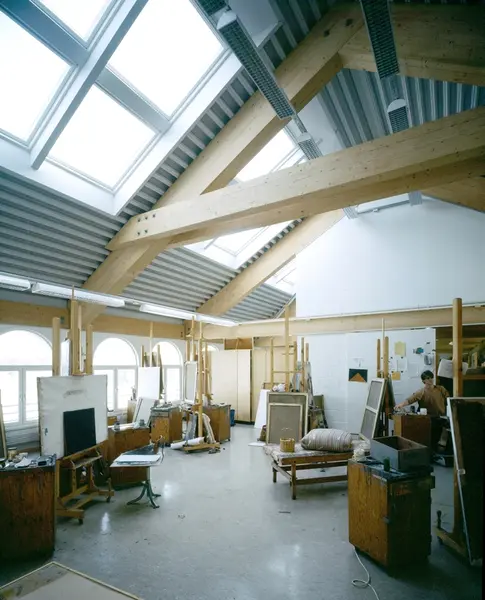Interiørfoto av atelier i øverste etasje på Statens håndverk og kunstindustriskole.