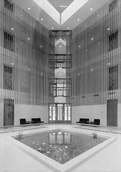 Arkitekturfoto av den Amerikanske ambassade i Oslo. Ambassaden er tegnet av den Finsk-amerikanske arkitekten Eero Saarinen og sto ferdig i 1959.