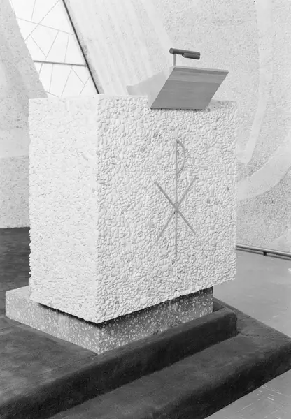 Prekestolen i Bakkehaugen kirke i Oslo. Kirken ble opprinnelig tegnet av arkitekt Ove Bang, som vant konkurransen i 1940. Erling Viksjø modifiserte tegningene etter krigen og kirken sto ferdig i 1959. Utsmykninger av Kai Fjell og Carl Nesjar.
