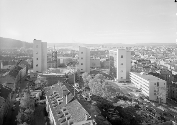Arkitekturfoto av OBOS-blokkene på Enerhaugen i Oslo. Blokkene blei bygd etter en omfattende renovering av området, som blant annet førte til riving av trehusbebyggelse. Noen av disse trehusene er bygd opp igjen på Folkemuseet på Bygdøy.