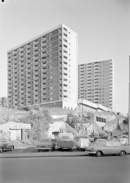 Arkitekturfoto av OBOS-blokkene på Enerhaugen i Oslo. Blokkene blei bygd etter en omfattende renovering av området, som blant annet førte til riving av trehusbebyggelse. Noen av disse trehusene er bygd opp igjen på Folkemuseet på Bygdøy.