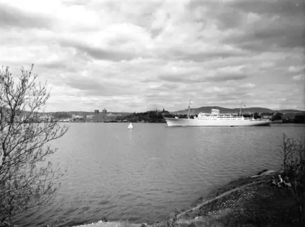 Fra Hovedøya med utsyn over Oslofjorden med Oslo sentrum i bakgrunnen. Passasjerskipet "Oslofjord", bygget 1949, ligger på fjorden. 1950.