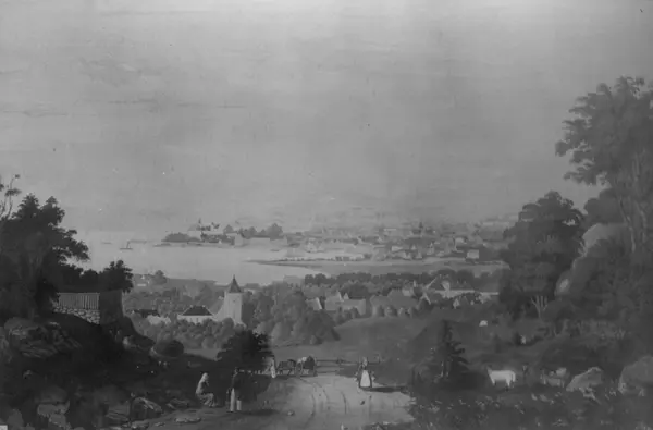 Oslo, 1940-årene. Gouasche med utsikt over byen og fjorden fra Ekeberg. "Den Kulturhistoriske Udstilling i Kristiania 1901" på NF.