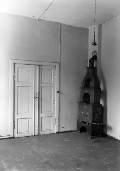 Akersgata 44, Oslo. Den gml.Fødselsstiftelse. Værelse ved siden av dåpsværelset. Dør og etasjeovn.
