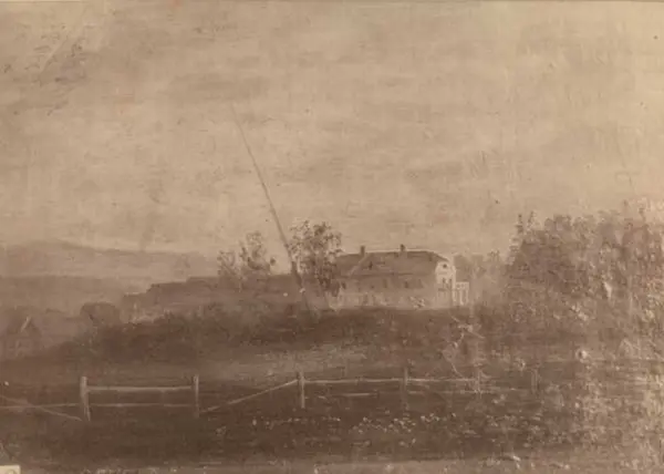 Lille Frogner, Oslo. Avfotografert oljemaleri av hus i landskap. Den kulturhistoriske Udstilling i Kristiania 1901.