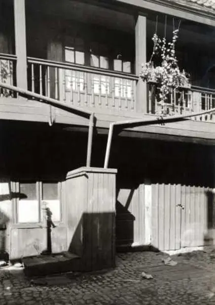 Kirkegata 7, Oslo. Bakgårdsbygning med svalgang og vannpost.