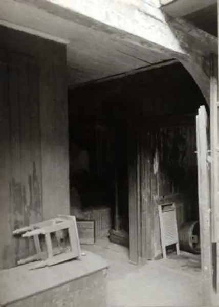 Kirkegata 7, Oslo. Bakgårdsbygning med svalgang, vindeltrapp og dragkjerre.