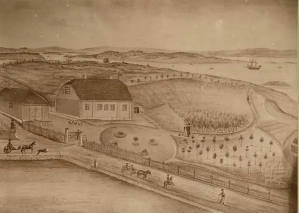 Skillebekk, Oslo. "Boghandler Hartmanns Løkke". Avfotografert tegning. Den kulturhistoriske Utstlling i Kristiania 1901.
