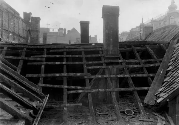 Tollbugata 14, Oslo. Hus under riving. Taket. Nå på Norsk Folkemuseum. Håndtverkergården/Bokbindergården.