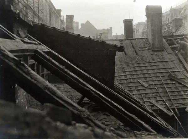 Tollbugata 14, Oslo. Hus under riving. Nå på Norsk Folkemuseum. Taket. Håndtverkergården/Bokbindergården.