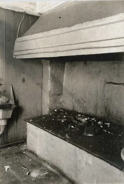 Tollbugata 14, Oslo. Hus under riving. Nå på Norsk Folkemuseum. Peis. Håndtverkergården/Bokbindergården.