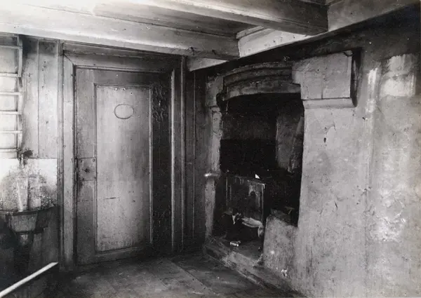 Tollbugata 14, Oslo. Hus under riving. Nå på Norsk Folkemuseum. Interiør med ovn og vask. Håndtverkergården/Bokbindergården.