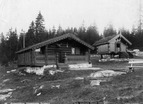 Frognerseteren, Oslo før 1892. Avfotografert postkort. Små gamle norske bygninger.