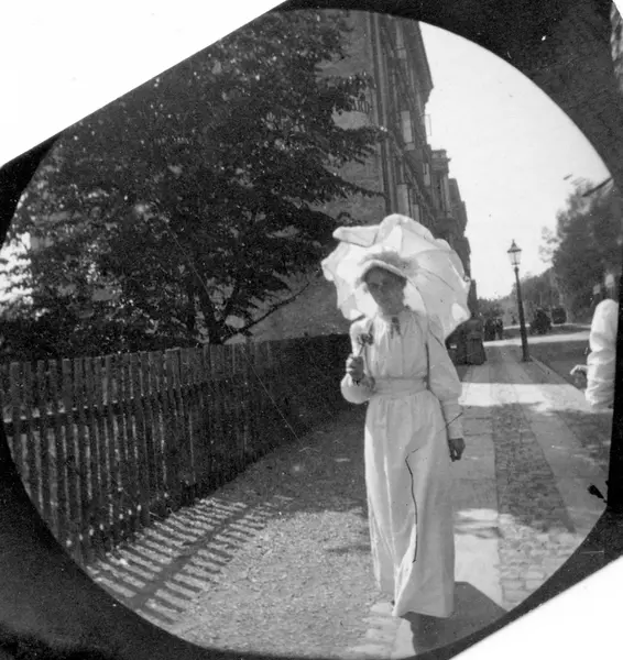 Frk. Signe Faye Hansen spaserer på fortau langs gjerde, Oslo.