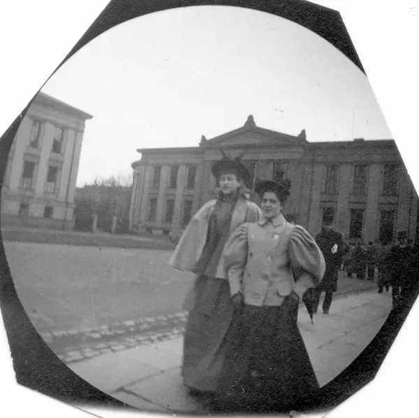 To kvinner utenfor Universitet på Karl Johans gate, Oslo. Til venstre frk. Aagot Tingulstad, til høyre frk. Nandrup.