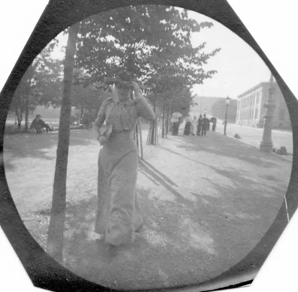 Frk. Anna Ording i Studenterlunden, Oslo, med Universitetet i bakgrunnen.