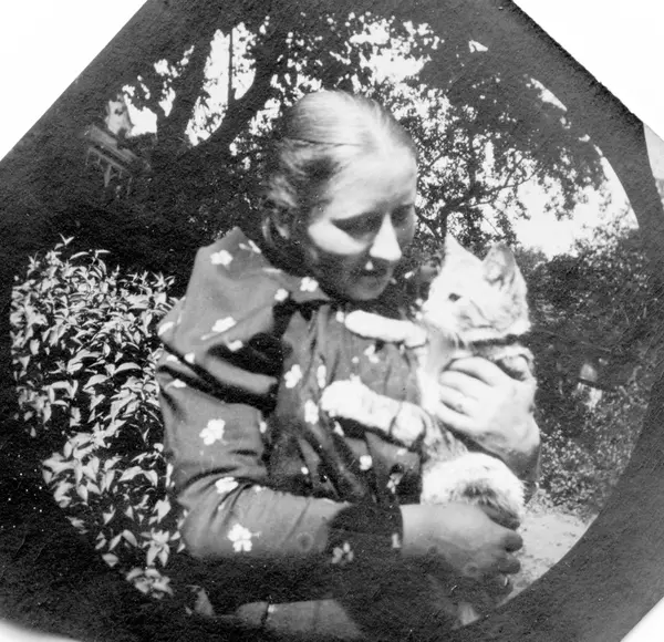 Professor Blytts stuepike og katt, Oslo. Kvinne med stripet katt på armen i hage.