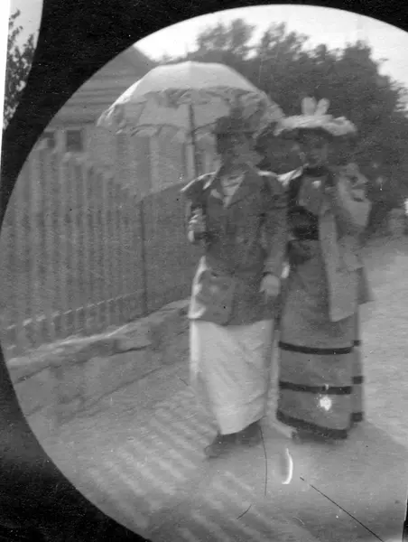 Frk. Anna Ording og frk. Ingeborg Willumsen spaserer langs gjerde.