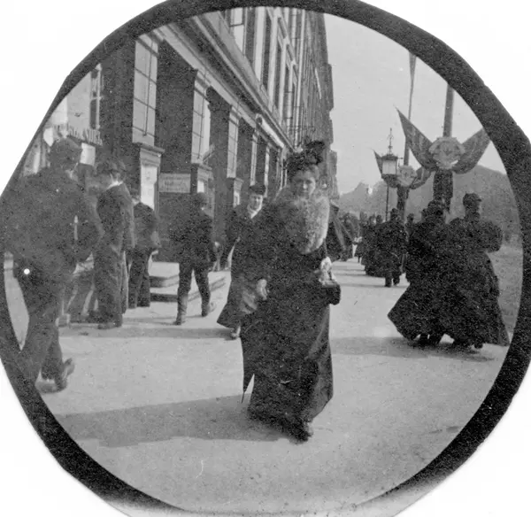 Gatebilde med mange mennsker og flaggdekorasjoner på stolper. Fru Movinkel, født Sverdrup, midt i bildet. Muligens Karl Johans gate, Oslo.