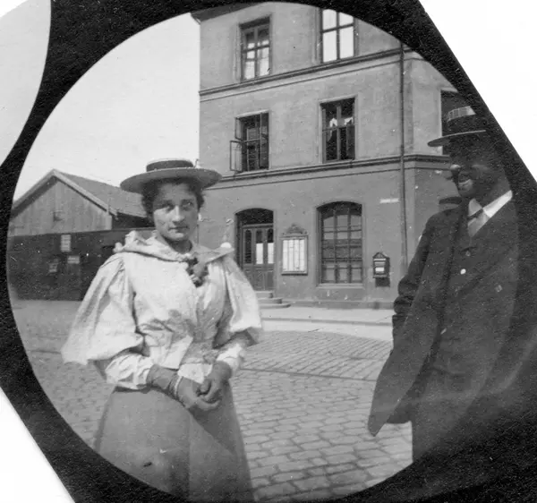 Frk. Collet og professor Thue, senere gift med hverandre, står i bygate. Mur bygård og lave verkstedsbygninger. Postkasse på veggen.