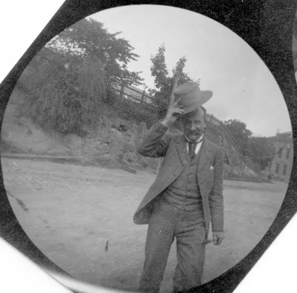 Hr. Fischer, bror til Petter Fischer står i park og letter på hatten.