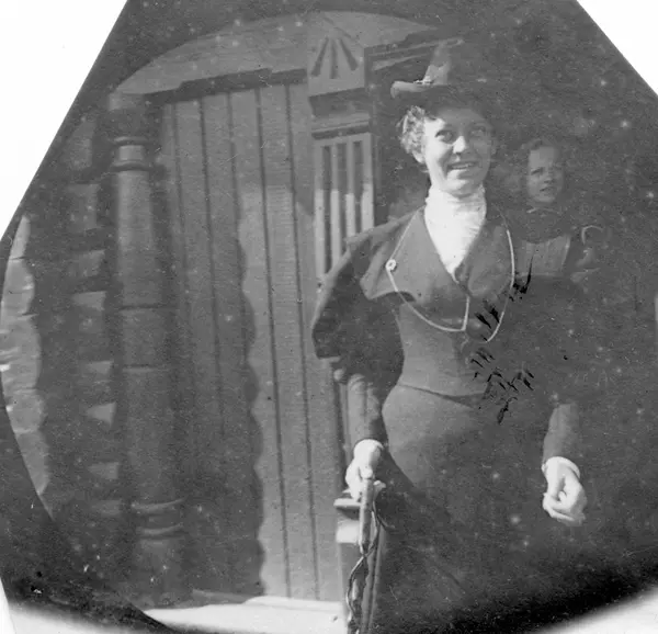 Golå, Sør-Fron, Oppland. Frk Alnæs står ved utskåret døråpning til tømmerhus.