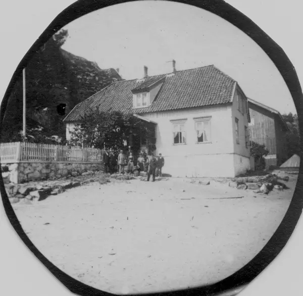 Fra ekskursjon med professor Blytt til Kjerringvik, Tjølling, Vestfold. Gruppe foran hus og hagegjerde.