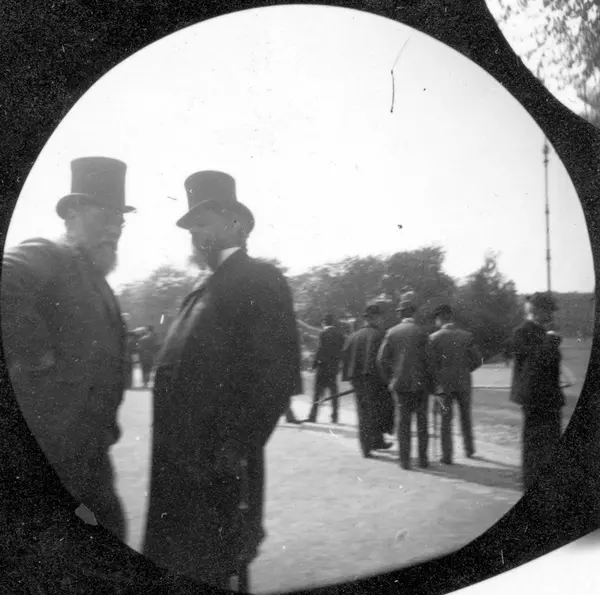 Stortingsmann Lund prater med en annen mann øverst på Karl Johans gate, Oslo. Slottet, Slottsparken og mennesker.