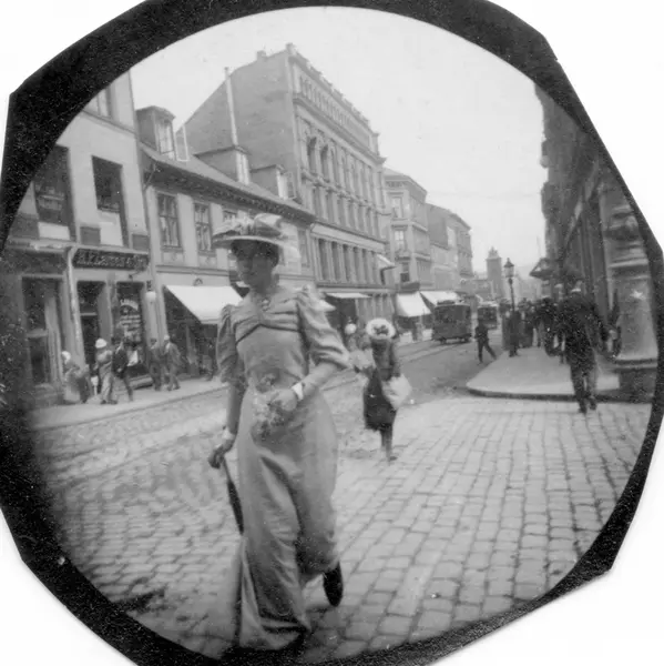 Frøken Lorbauer spaserer i Karl Johans gate. Tårnet lengst bort i gata er tårnet på den gamle Brannvakta