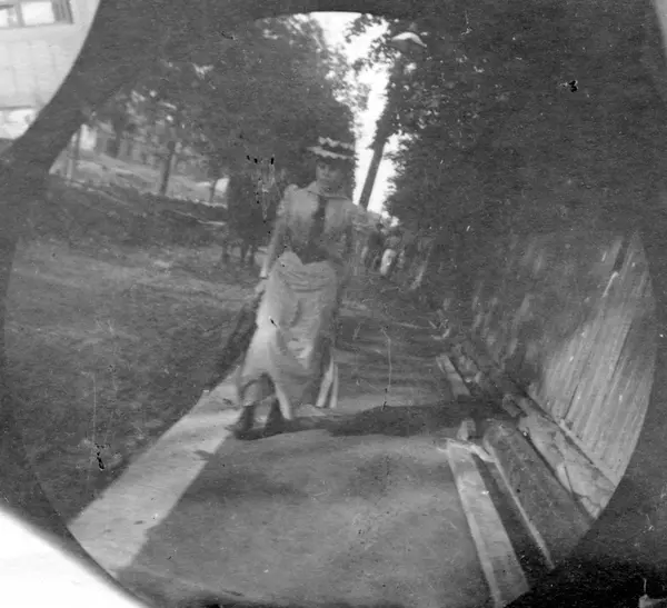 Frk. Engelschiøn spaserer på fortau langs gjerde, ant. Oslo.