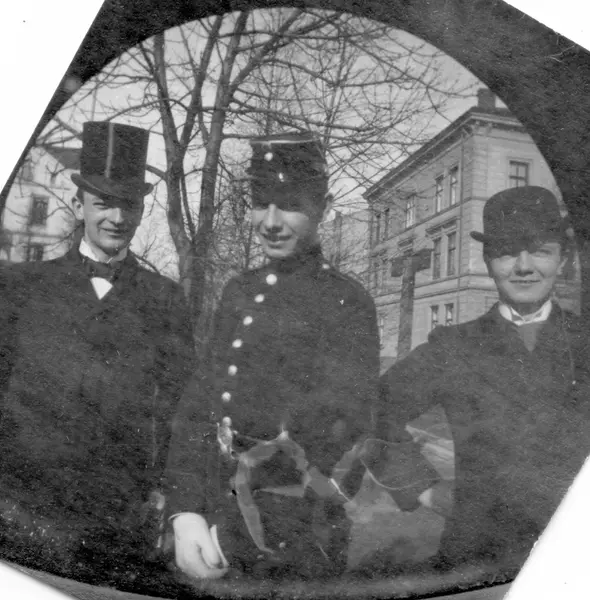 Tre menn i bygate, en med flosshatt og en i uniform.