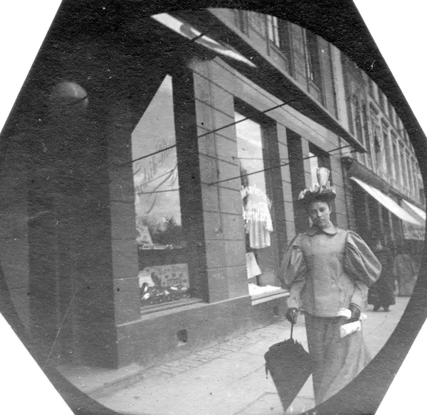 Frk. Bergliot Larsen spaserer langs fortau forbi butikk med markiser, ant. Oslo.