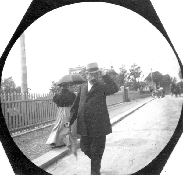 Overlærer Wallem, med hånden på hatten, spaserer i gate langs gjerde.Hestevogn og villa i bakgrunnen.