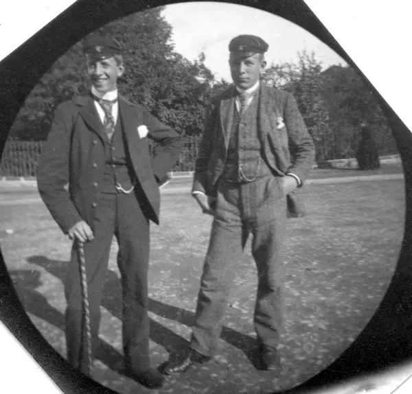 Herman Reimers og Hartvig Nissen med studentluer i park, ant. Oslo. Studenter fra 1892.