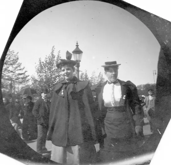 Frk. Just senior og en annen kvinne spaserer i gate ved park, Oslo.