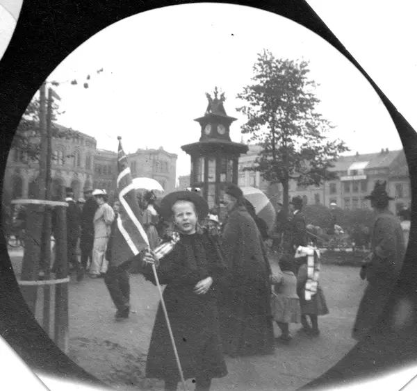 Betty Reimers, datter av høyesterettsass. Reimers. Lita jente med flagg på Karl Johans gate, Oslo. Stortinget i bakgrunnen.