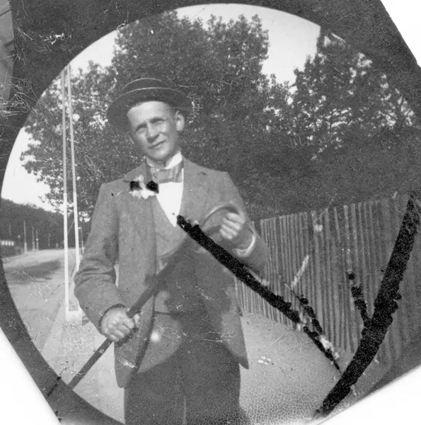 Niels Heitmann på fortau langs gjerde. Student fra 1892.