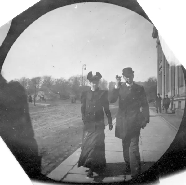 Frk. Duddu Bull og hr. Skjoldborg spaserer langs Karl Johans gate og Universitetet, Oslo. Senere gift med hverandre..