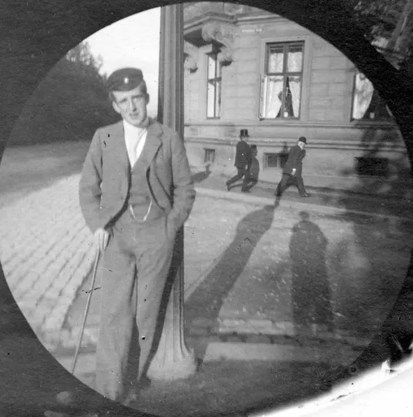 Student Bilten (?) Hiorthdal står lent mot lyktestolpe i gatekryss med bygård bak, Oslo. Student fra 1892.
