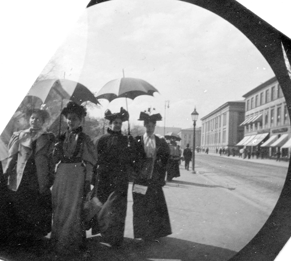 Fire kvinner på fortau langs Karl Johans gate, Oslo. Til høyre frk. Harriet Solberg.