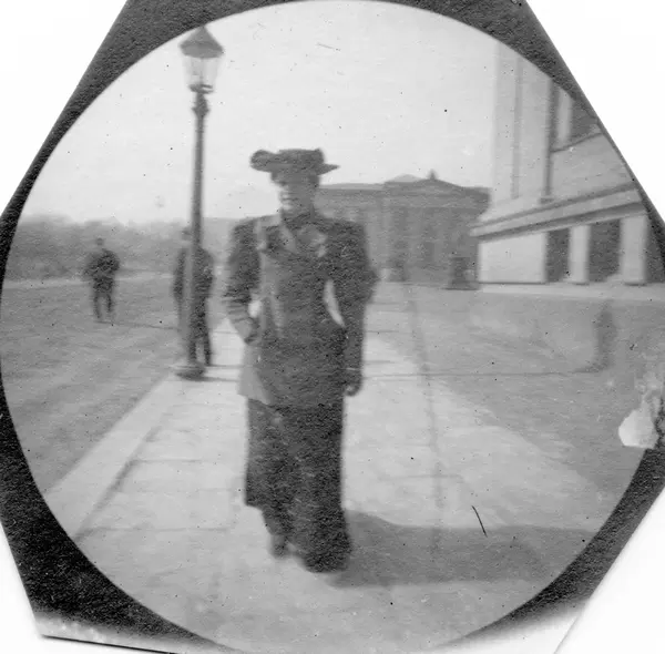 Frk. Helma Meier spaserer langs Karl Johans gate, Oslo, ved Universitetet.