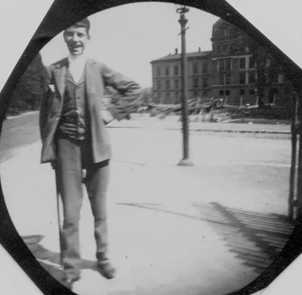 Jacob Sommerfeldt, senere kaptein, står på fortau med bygårder i bakgrunnen, ant. Oslo.