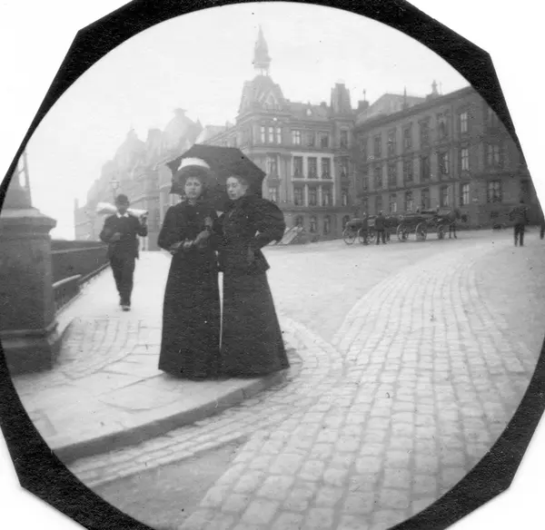 Thora Christoffersen og Alette Thoulow, senere fru Fougner, står på fortau ved Victoria terrasse i Oslo. Plass med bygårder og hestedrosjer.