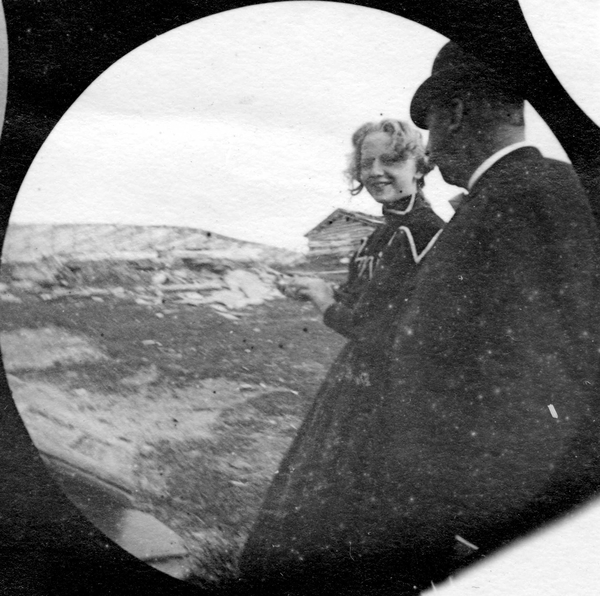 Frk. Alnæs og en mann i fjellandskap med seterbuer og skigard, Golå, Sør-Fron, Oppland.
