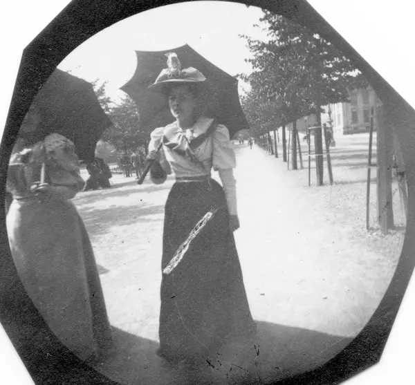 Frk. Krohn fra Bergen og en annen kvinne spaserer i Studenterlunden. Oslo, Universitetet skimtes.