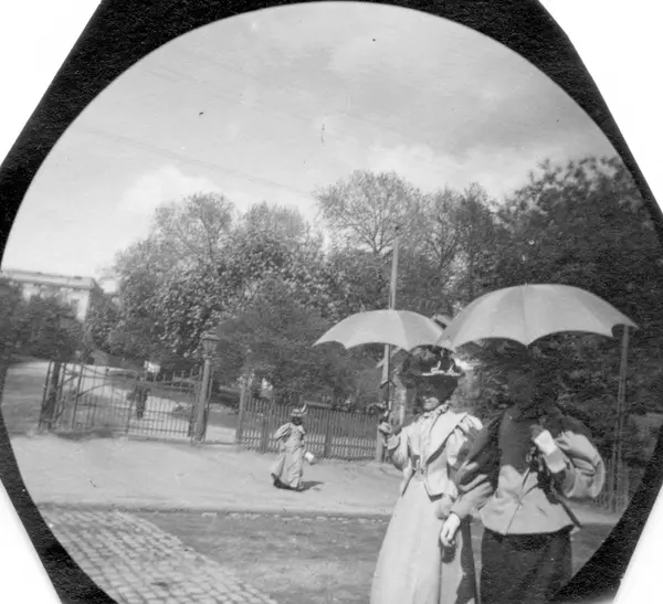 Frøknene L´Orange, døtre av general L´Orange, spaserer i gate langs park.