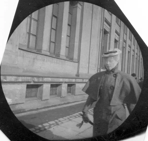 Fru Dagmar Engelhardt spaserer langs Universitetet. Oslo,